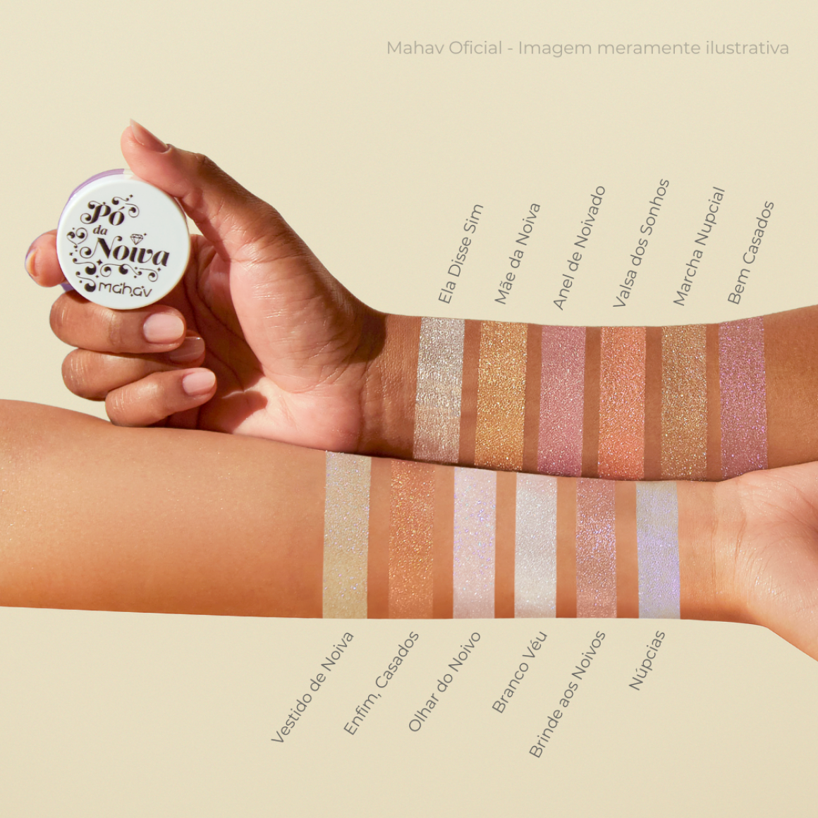 Experimente usar o PÓ DA NOIVA ILUMINADOR MAHAV também como sombra ou em efeitos de iluminação no colo (acredite: é perfeito!), ou ainda como acabamento nos lábios sobre o batom. Aplique uma camada da BRUMA FIXADORA MAHAV antes e depois da aplicação do PÓ DA NOIVA MAHAV para potencializar ainda mais o brilho e aumentar a durabilidade da make.