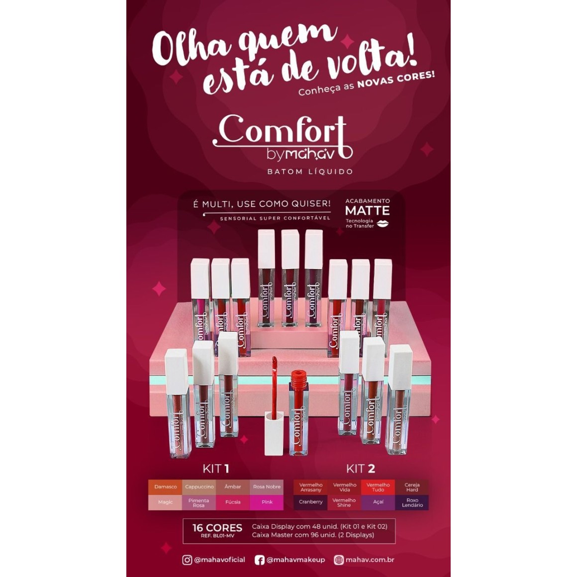 O Batom Comfort Mahav é formulado com ingredientes emolientes e condicionantes que conferem à mucosa labial muito conforto. Desenvolvido para lábios mais secos e maduros, não transfere, alta pigmentação, cobertura uniforme e boa durabilidade, fixação e espalhabilidade.