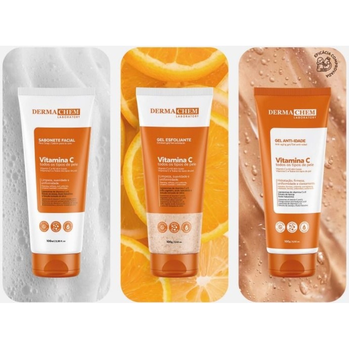 Descrição: contém kit com 1 sabonete vitamina c, 1 gel esfoliante vitamina c e 1 gel anti-idade vitamina c