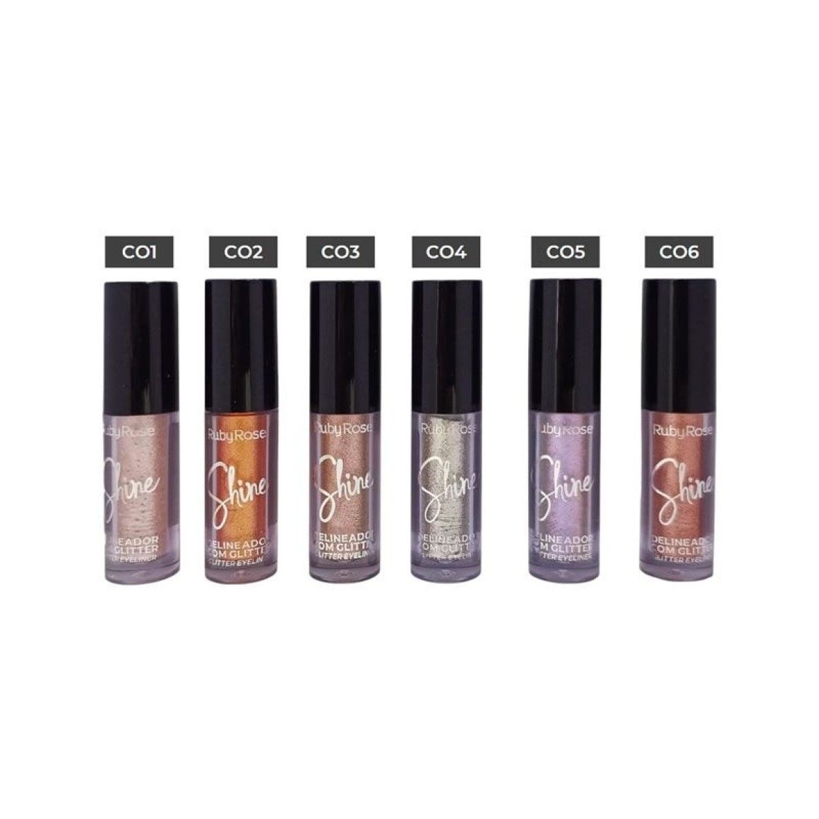 Contém: Box com 36 unidades sendo 6 delineadores glitter shine Ruby Rose de cada cor + 6 mini provadores
