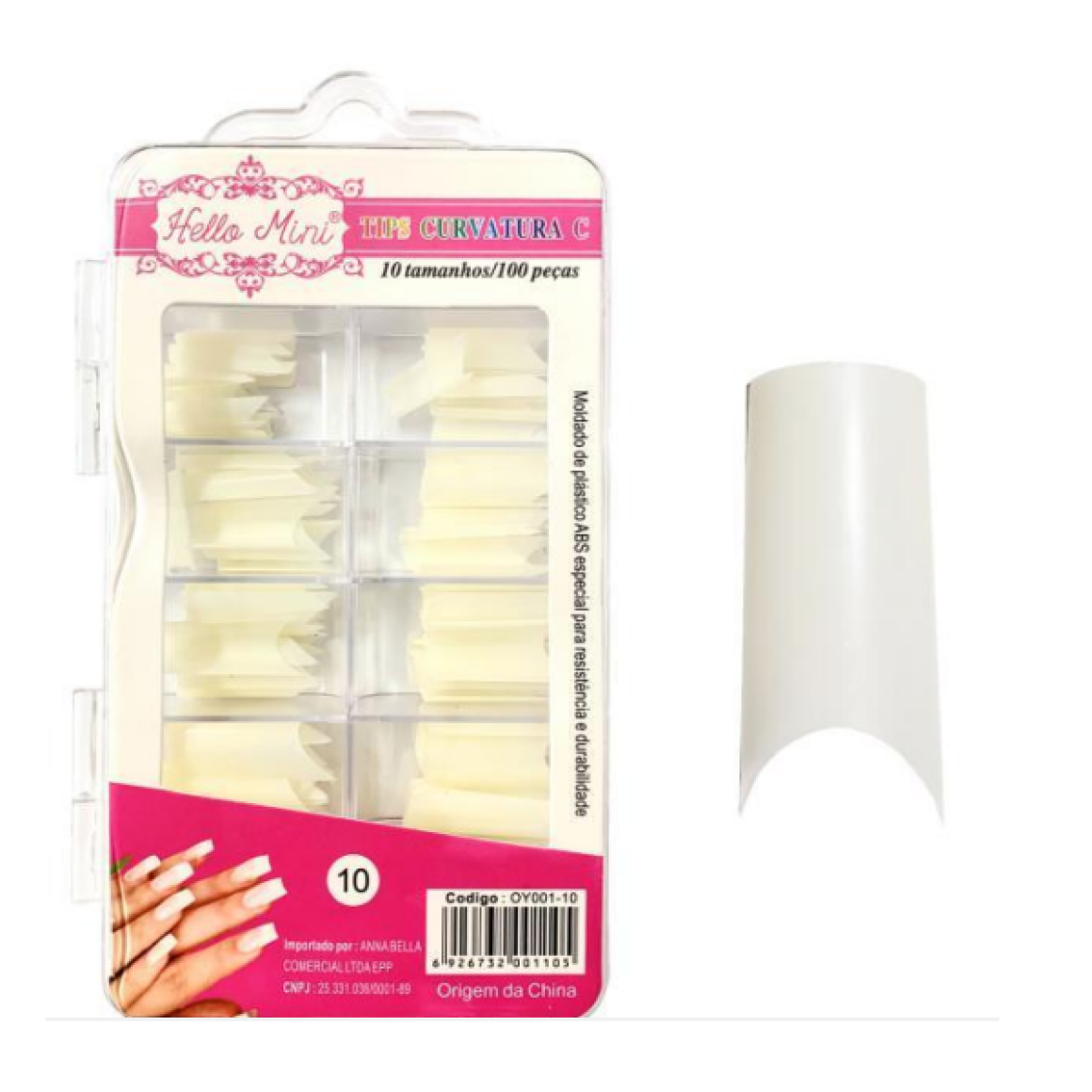 Características Técnicas - Modelo: OY001-10 - Tips Curvatura C - Contém: Kit com 100 unhas postiças/10 tamanhos diferentes - Material: Plástico ABS de alta resistência e não trinca - Alonga e dá maior beleza e fino acabamento nas suas unhas - Os tamanhos são separados em compartimentos separados individuais para sua praticidade - Cola não inclusa