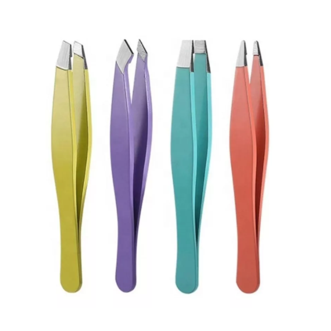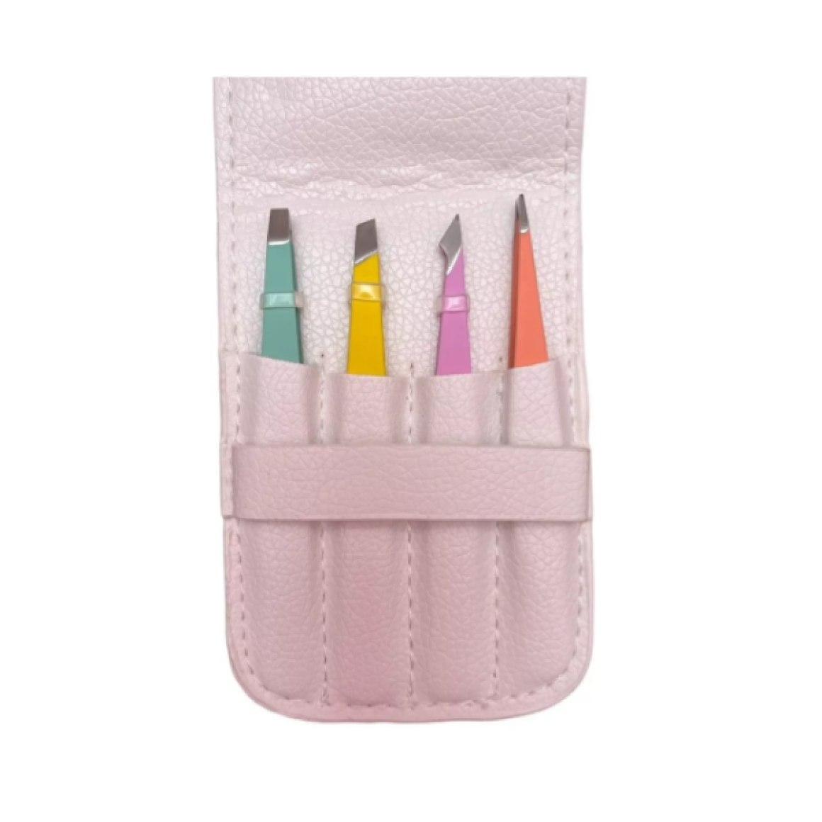 Kit de 4 pinças coloridas com estojo para realizar design de sobrancelha, pinças com pontas precisas. Cores pastéis foscas e levemente emborrachadas.