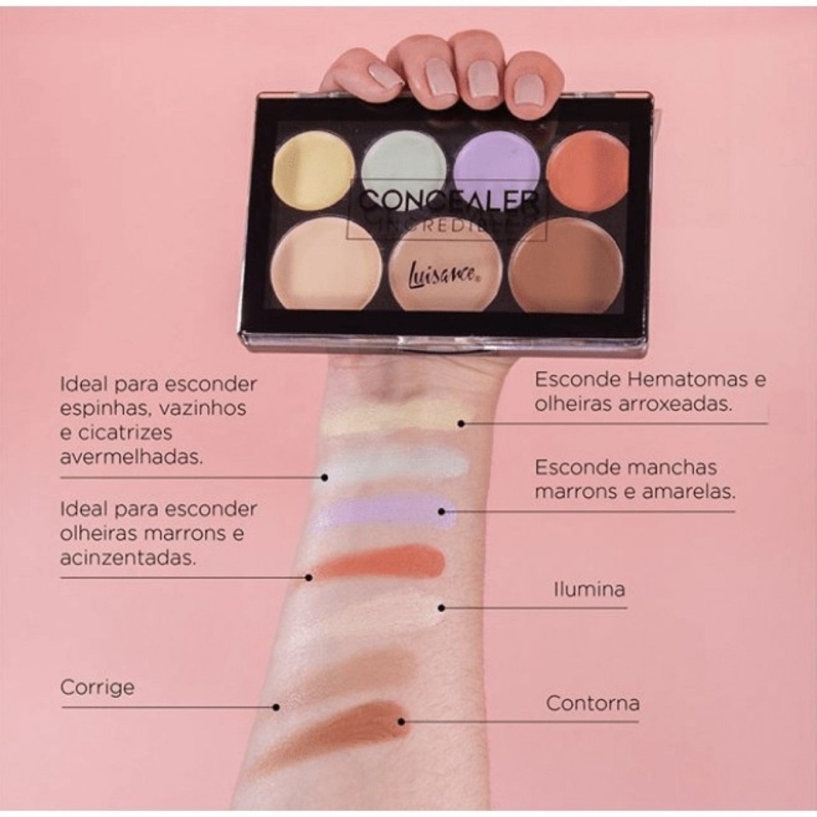 A paleta de corretivos cremosos Incredible Concealer da Luisance possui tons para contorno e cobertura e possui também 4 tons de corretivos coloridos que servem para: