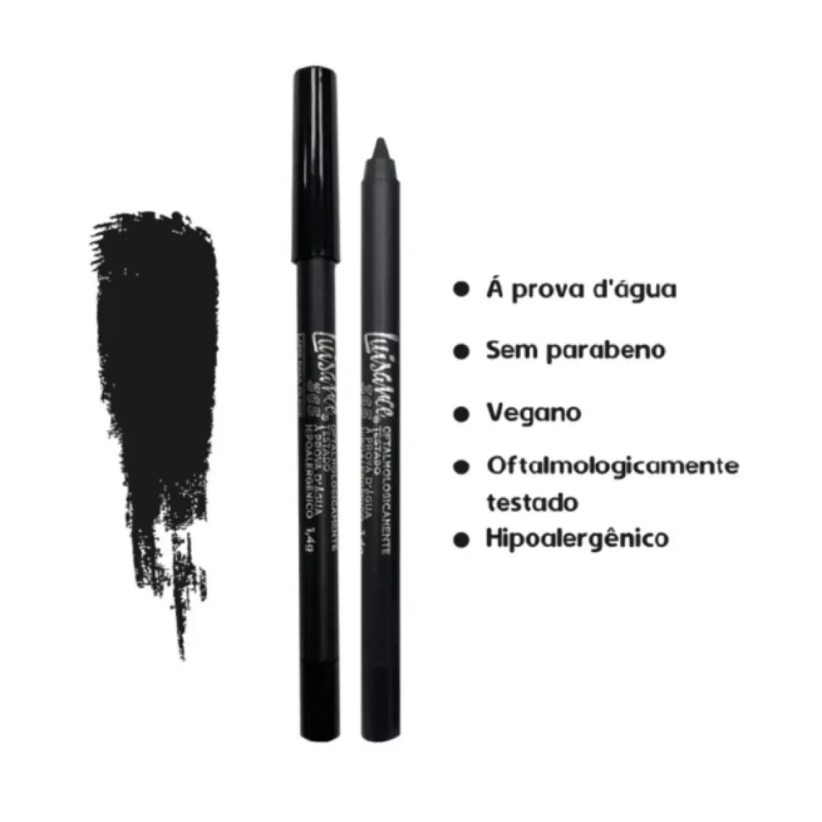 O lápis para os olhos da Luisance é super macio e desliza facilmente nos olhos, o produto é bem pigmentado e tem um incrível preto, sendo a prova d'água. O lápis é de apontar e não retrátil.