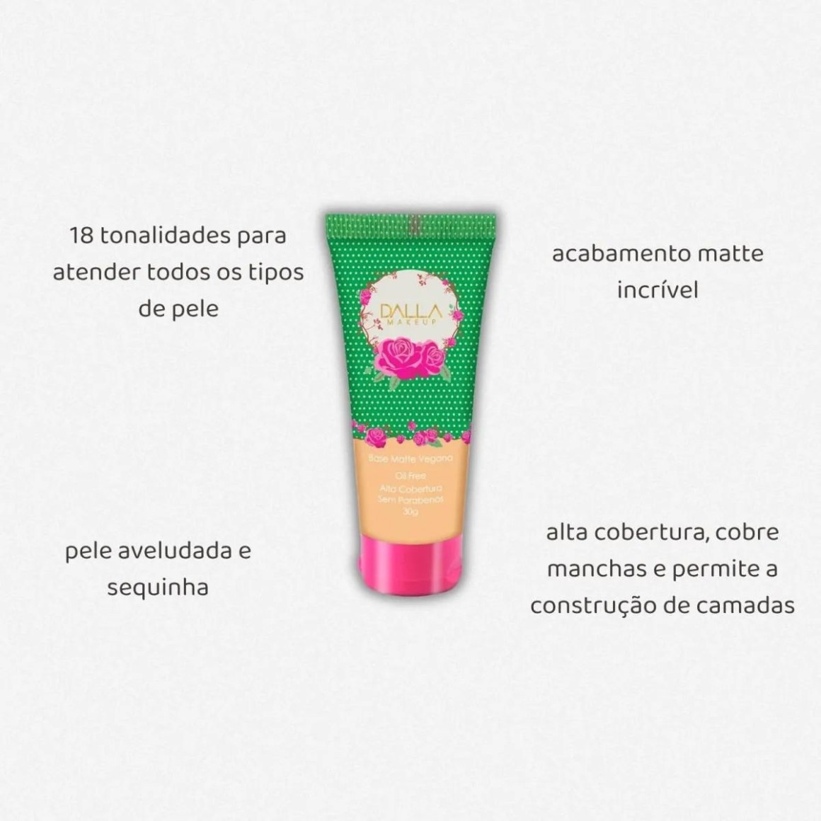 A Base Matte Vegana da Dalla foi desenvolvida especialmente para atender a pele das brasileiras, ela contém cobertura excepcional e longa resistência na pele. Com ela você pode construir camadas bem estruturadas, com maior cobertura para a sua pele, mas também pode produzir uma cobertura de efeito mais natural, como você preferir e sem prejudicar seu acabamento final.