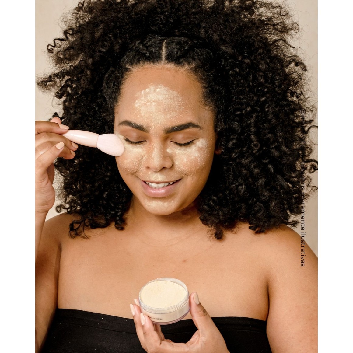 Com o auxílio de um pincel para aplicação de pó, encoste delicadamente no produto, retirando o excesso. Aplique de maneira uniforme pelo rosto e faça movimentos leves e circulares de dentro para fora.