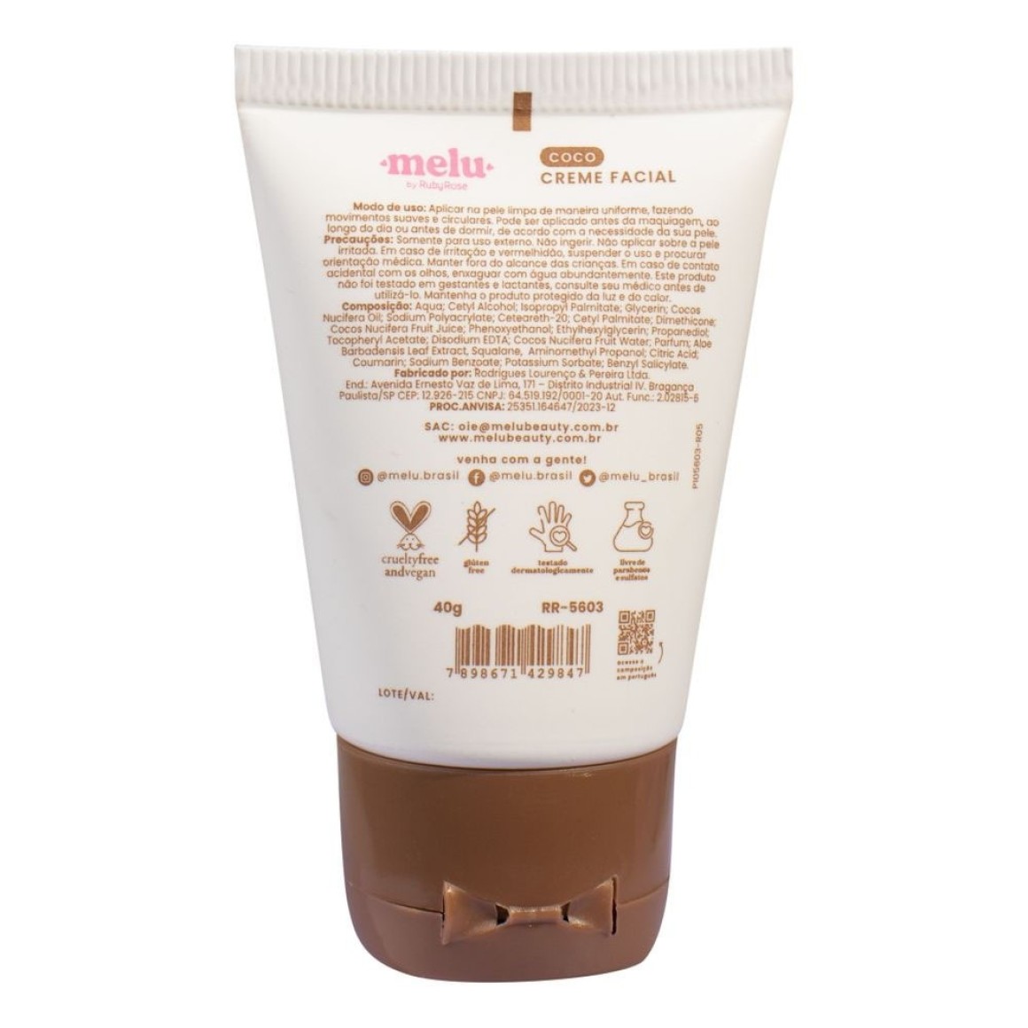 O Creme Facial MELU traz em sua fórmula a combinação de ÁGUA DE COCO e LEITE DE COCO que ajuda na Hidratação, nutrição e regeneração da sua pele, combatendo o ressecamento e envelhecimento precoce. Um poderoso creme com complexo vitamínico que responsável por preencher os espaços entre as células e é indicado para redução de rugas e linhas de expressão.