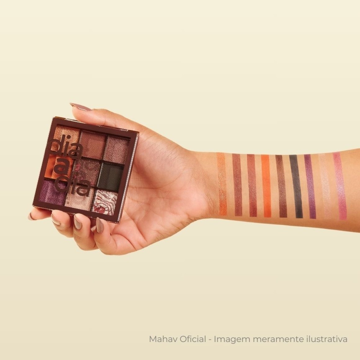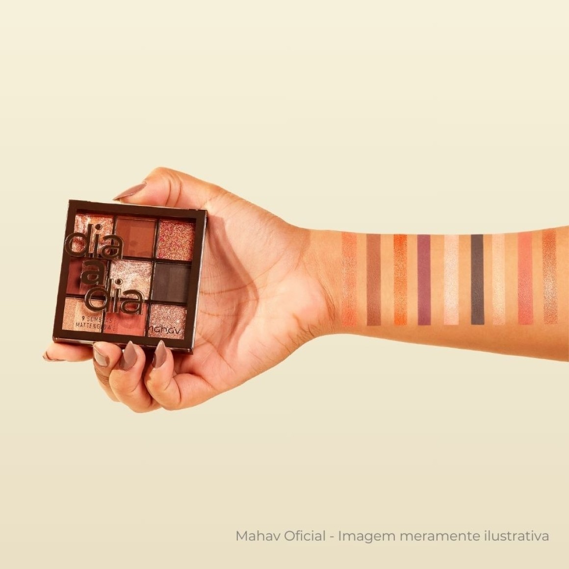 A PALETA DE SOMBRAS 9 CORES DIA A DIA MAHAV traz tons variados e versáteis, a principal característica desta belezinha são os pigmentos utilizados na criação das cores. No mesmo estojo apresentamos os tons matte que são considerados clássicos, os cintilantes super pigmentados e aveludados na versão de cores únicas e os cintilantes com fusão de dois ou mais pigmentos que dão um toque especial e sofisticado à produção. As cores combinam entre si e possibilitam diferentes propostas de make, podem ser aplicadas combinadas ou sozinhas, para o dia e para a noite, para todos os gostos, moods e estilos. É para criar looks lindos em qualquer ocasião!
