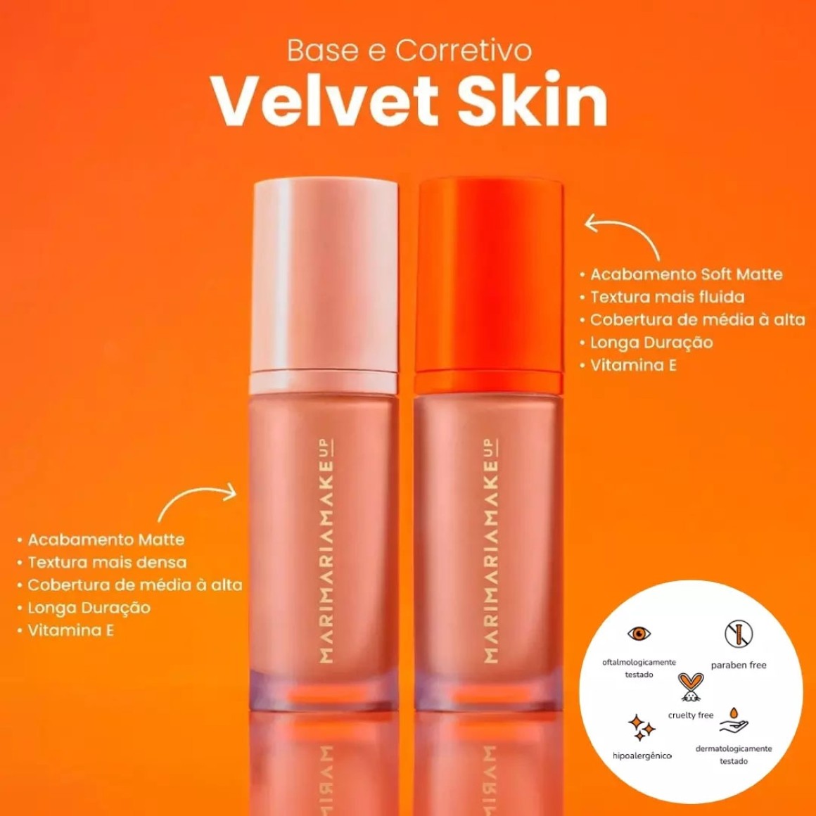 A nova Base e Corretivo Velvet Skin combina um acabamento aveludado e proporciona cobertura média à alta, possui longa duração e ajuda a minimizar as imperfeições