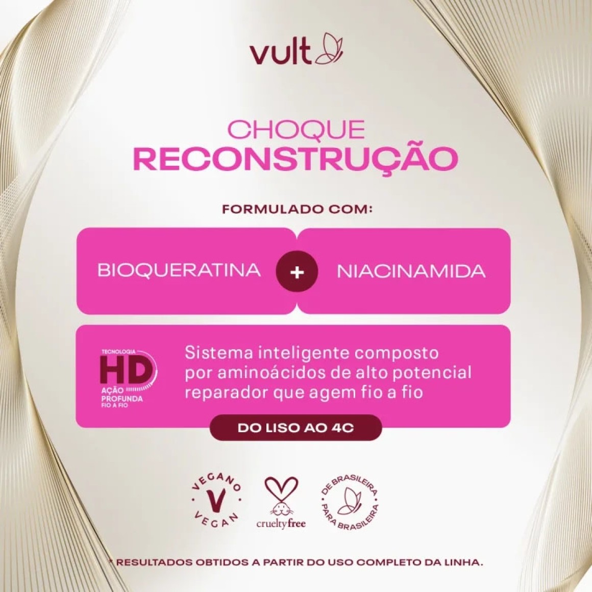 SHAMPOO: Com bioqueratina e niacinamida, o Shampoo Vult Cabelos Choque de Reconstrução restaura a fibra capilar, reduz danos e protege contra agressores diários (sol, secador, processos químicos etc.). Conferindo limpeza instantânea sem ressecar, deixando seus fios alinhados e sem frizz, este produto tem mais benefícios: