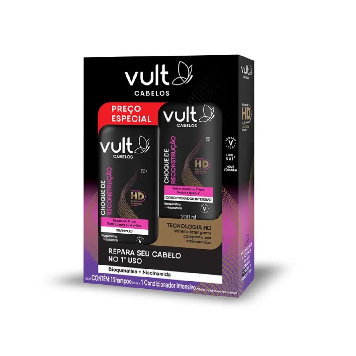 Vult Cabelos Choque de Reconstrução valoriza seu cabelo e te incentiva a cuidar dos seus fios, manifestando a beleza única que eles têm. O Kit Vult Cabelos Choque de Reconstrução traz a Tecnologia HD e proporciona tratamento em casa para fios reparados, com menos danos e cheios de brilho desde o 1º uso ¹.