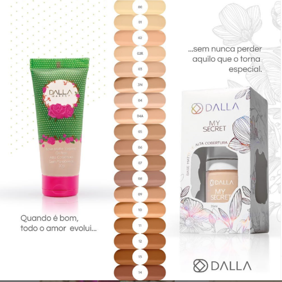 A Dalla traz uma base que é um verdadeiro presente para você! A Base My Secret é a base de alta performance que você esperava com alta cobertura efeito matte que uniformiza a pele, alta durabilidade, resistente a água e ao suor. Além disso, sua fórmula contém um componente hidratante que contribui para restabelecer os níveis de água na pele que protege e preserva sua elasticidade tudo isso em uma embalagem linda e presenteável.