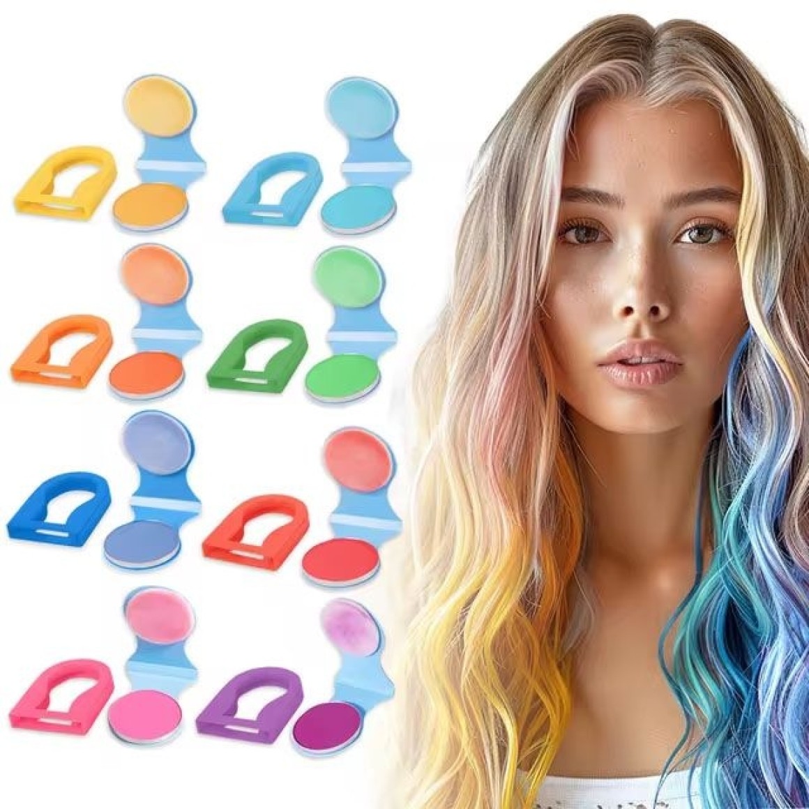 Pó de giz para coloração temporária de cabelos, possibilitando um penteado mais diferente e divertido.