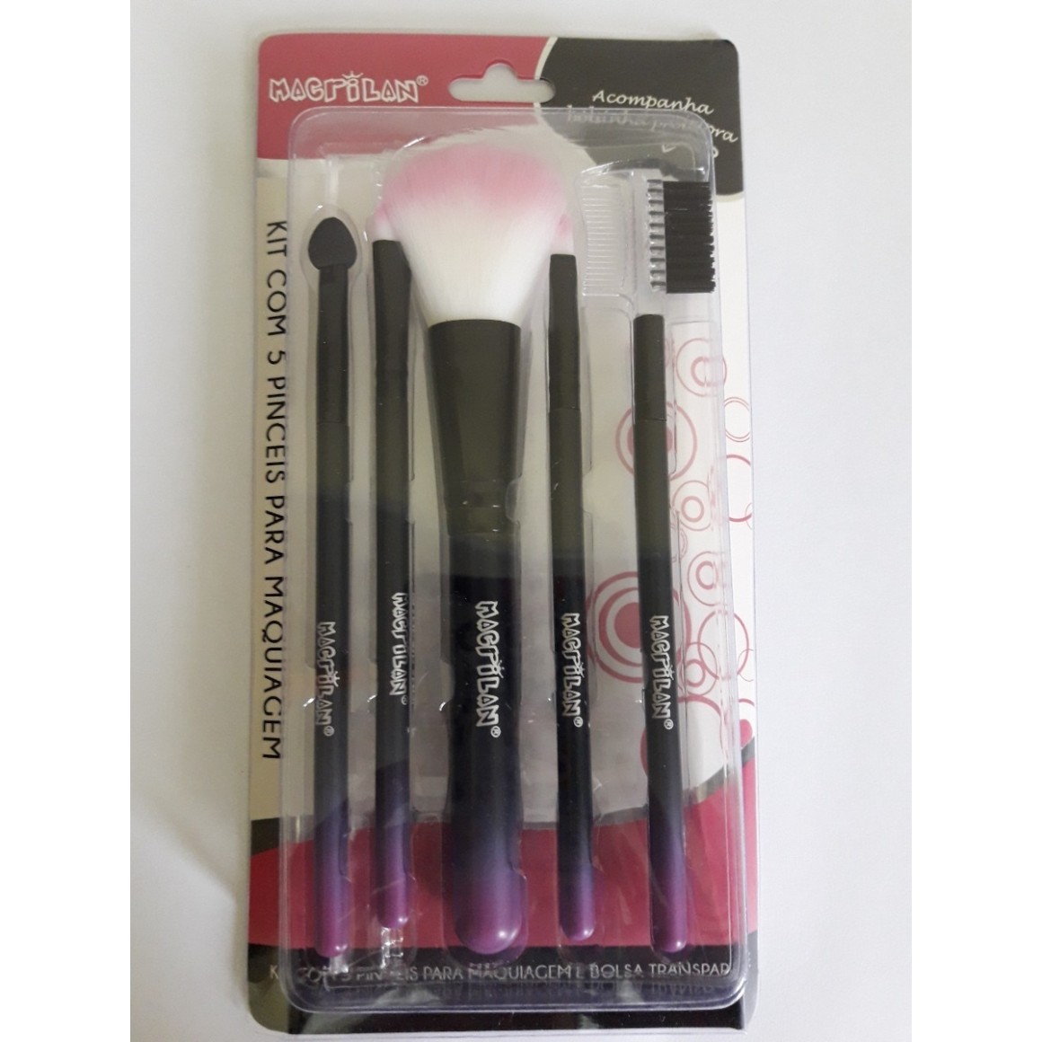 Kit Píncel Macrilan com cerdas sintéticas, macias e arredondadas para maquiagem.