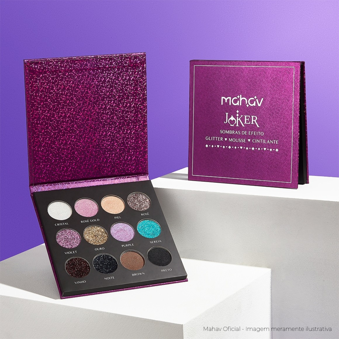 A PALETA JOKER SOMBRAS DE EFEITO MAHAV chegou para surpreender, encantar e conquistar você de uma vez! São 3 tipos de sombras de efeito que são facilmente aplicadas e mudam completamente o seu look: glitter, mousse e cintilantes.