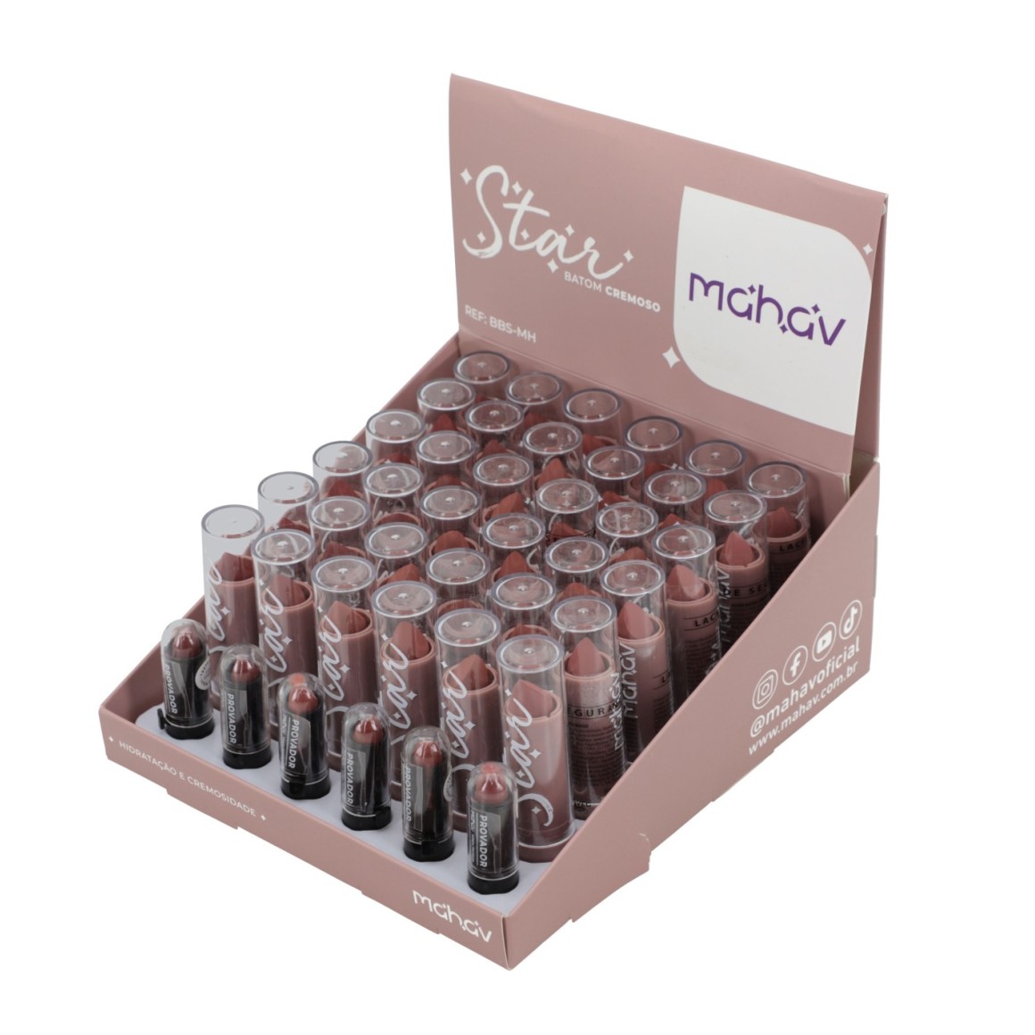 O Batom Bastão Star Mahav oferece textura cremosa e suave que desliza facilmente nos lábios, proporcionando aplicação uniforme e confortável. Com alta pigmentação já na primeira camada, forma uma película fina com cobertura intensa e sensorial confortável. Está disponível em acabamento SOFT MATTE e possui uma cartela com 6 cores clássicas e atemporais.