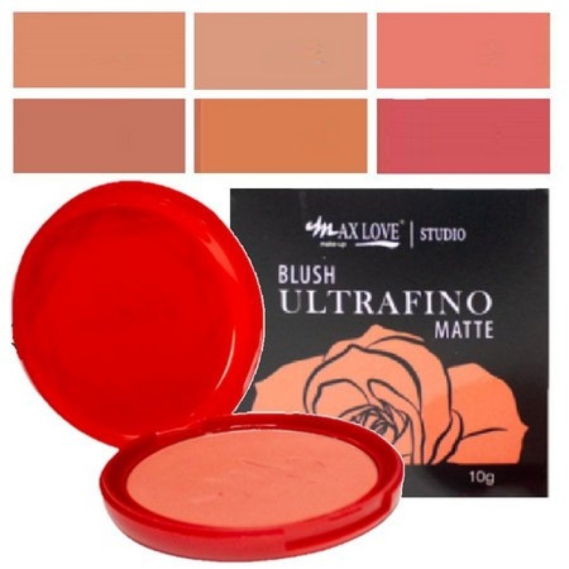 O Blush Ultra Fino Matte da Max Love possui 06 cores, podendo ser usado por peles claras ou escuras, tendo uma acabamento matte, textura leve, com partículas finas, dando um ar de naturalidade ao rosto.