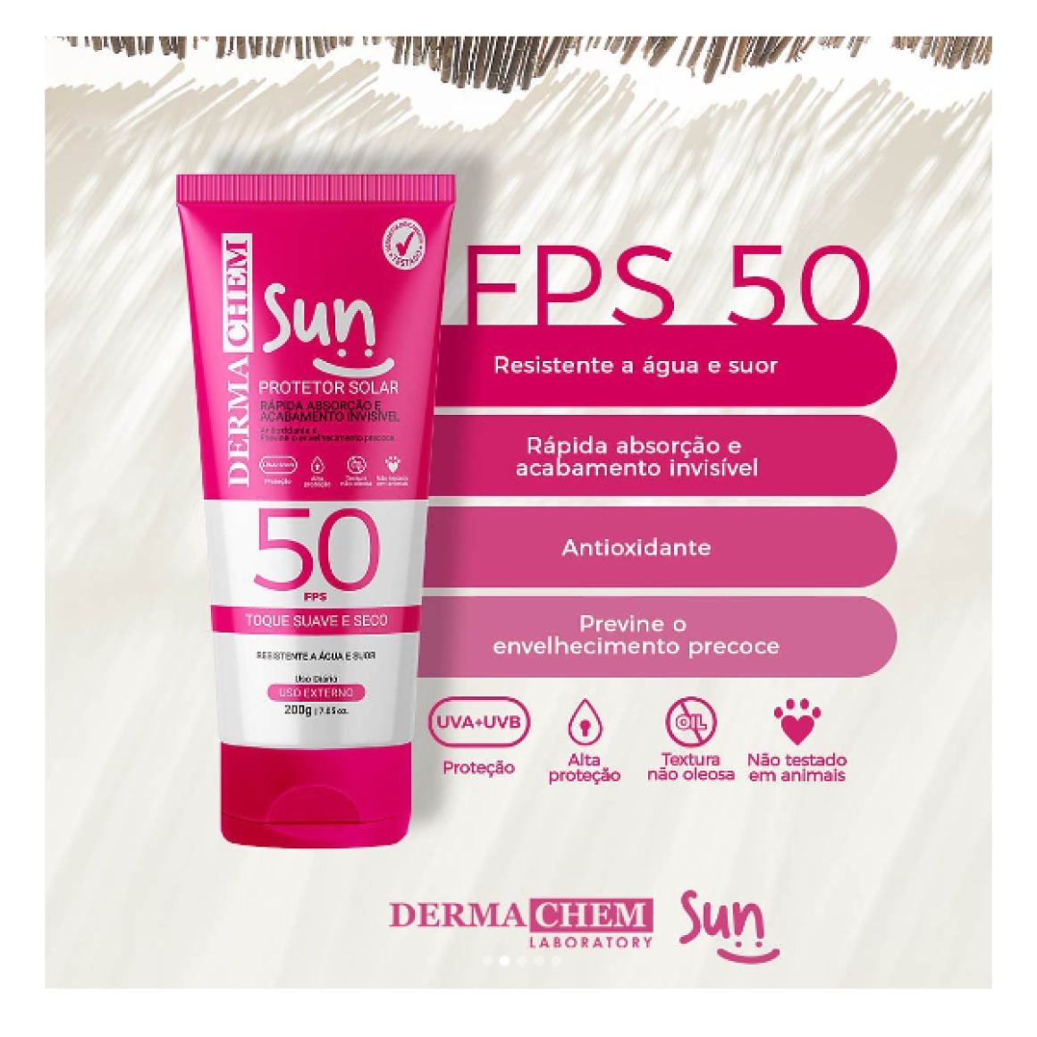 01un Protetor Solar FPS 50 120G - Protetor Solar FPS 50 Dermachem SUN, foi formulado com a melhor tecnologia de ativos do mercado em termos de proteção solar contra radiação UVA e UVB. Sua tecnologia e ação de agentes antioxidantes presentes na fórmula auxiliam na proteção da pele contra o envelhecimento precoce. Ativos que absorvem a oleosidade, deixando a pele com toque seco e efeito matte.