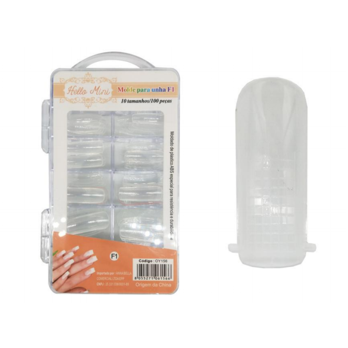 Molde para Unha F1 Hello Mini Contém 01 unidade. Possui 10 tamanhos diferentes, com 100 peças. Moldado de Plástico ABS especial para resistência e durabilidade para moldar unhas de gel, cristal e porcelana, a maneira mais rápida e eficaz de se fazer unhas.